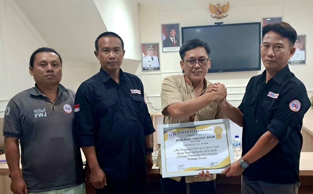 BOGOR KABUPATEN |SP.com- Kepala Dinas Sosial (Dinsos) Kabupaten Bogor Farid Ma’ruf diapresiasi Forum Wartawan Jaya (FWJ) Indonesia. Penyampaian apresiasi itu sebagai bentuk pengabdian dan kerja keras Kadinsos untuk warga Bogor. Selain itu FWJ Indonesia Korwil Kab. Bogor menilai apresiasi itu juga sebagai bentuk penjagaan humanitas serta sinergitas terhadap Jurnalis.